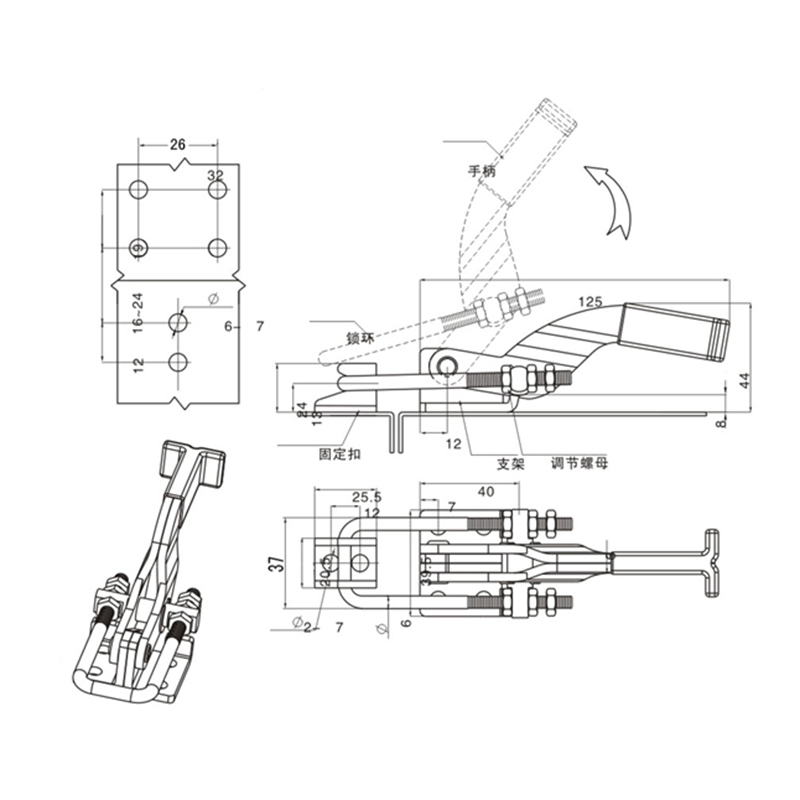 材質及表面處理:鍍鋅鋼、不銹鋼扣體,把手帶塑料套。